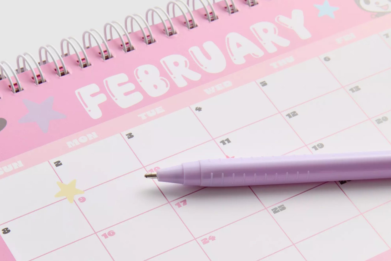 The sturdy stand-up format sits neatly on desks, shelves or counters, while the monthly calendar pages offer plenty of space for notes and reminders. It also includes a matching pen that slots neatly into the front, plus a detachable hanging mascot charm which can be used on bags, pencil cases or keys if preferred.